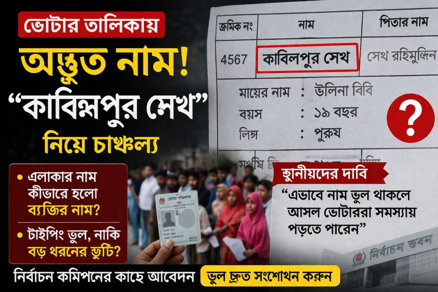 স্থানীয় এলাকায় প্রকাশিত নতুন ভোটার তালিকায় দেখা গেল এক অদ্ভুত নাম — “কাবিলপুর সেখ”। সাধারণত ভোটার তালিকায় ব্যক্তির নাম থাকার কথা, কিন্তু এখানে একটি এলাকার নাম ব্যক্তির নাম হিসেবে উল্লেখ থাকায় তৈরি হয়েছে বিভ্রান্তি।